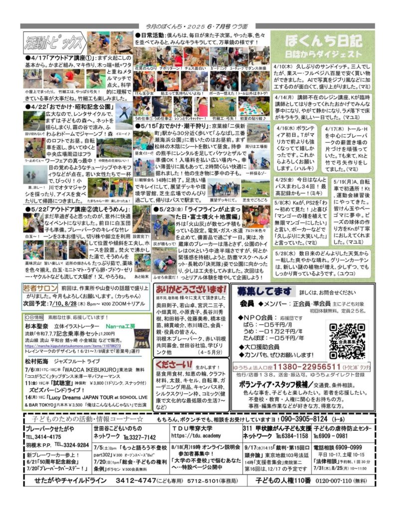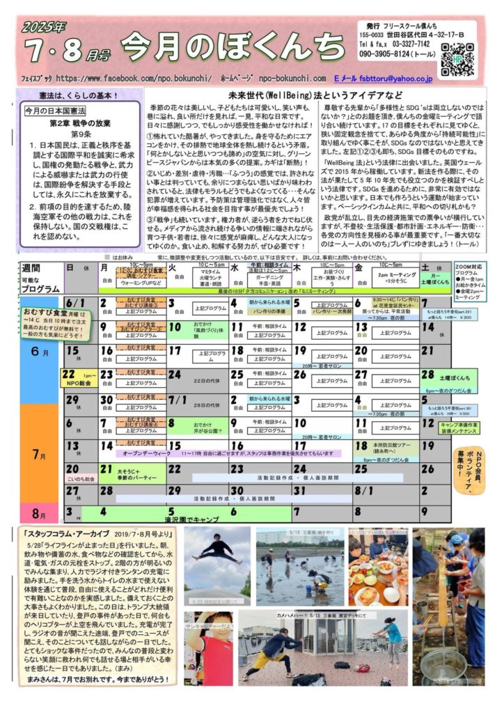 今月のぼくんち 7・8月号 2025年8月30日 最終更新日時 : 2025年9月16日 bokunchi_staff 毎週月曜日 おむすび食堂 開催中 時間:12〜14時(講座、シアター併催時は15時まで) 対象:子どもも大人もどなたでも! 参加費:無料 一緒におむすび食べて、ほっと一息つきませんか。食後も自由にお過ごしいただけます。精米したての無農薬米を握ってお待ちしています! フリースクールの見学、情報交換の場としての利用も可能です。お気軽にご参加ください。 注文:当日朝10時までにお電話ください
