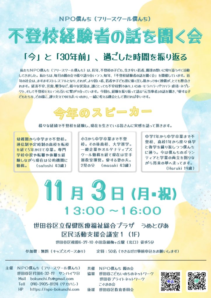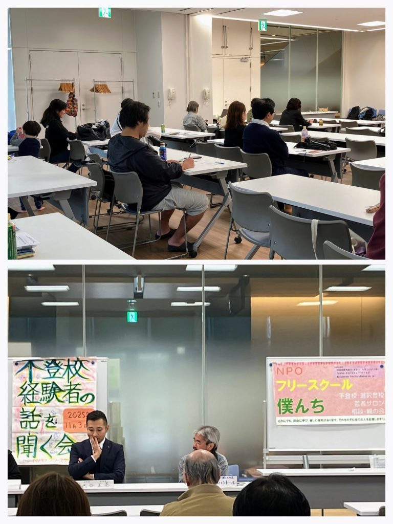 11/3『不登校経験者の話を聞く会』に登壇しました! 2025年11月3日 最終更新日時 : 2025年11月19日 bokunchi_staff 登壇者3名の経験談を聞き、「不登校」についてだけじゃなく一人一人違う生き方でも大丈夫だということが知れた会でした。 参加した方々からは、「また来年の開催を楽しみにしています!!」や「貴重な機会をありがとうございました。」といったお声を頂きました! ~当日の様子~ ↓前半は登壇者3名の自己紹介と、登壇者とトールさんとの深ぼりトークをしました。 ↓後半は登壇者3名を含めたグループ別での意見交換や、全体の質疑応答を行いました。 ↓子どもたちは折り紙や糸、おもちゃでお遊び!